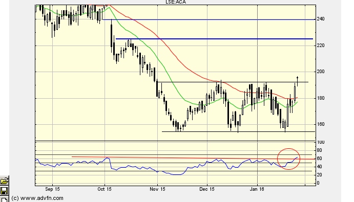 this is a tad speculative, as may be bear trap breakout, stops are a must(below todays low) move to profit on a rise. Cautious traders would wait for a close above the 195p breakout level.