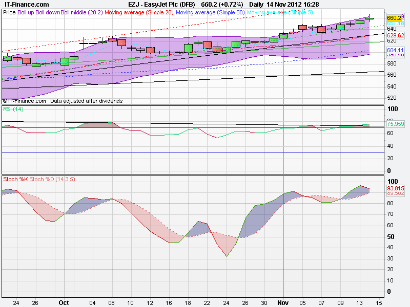 I have been following easy jet for a week or so. It is in overbought territory and is attempting, daily, to make new recent highs having been in a long term uptrend. I went short with a nibble this afternoon but got stopped out (IG index stopped me out at 670 when the trade high on iii is recorded as 667.5