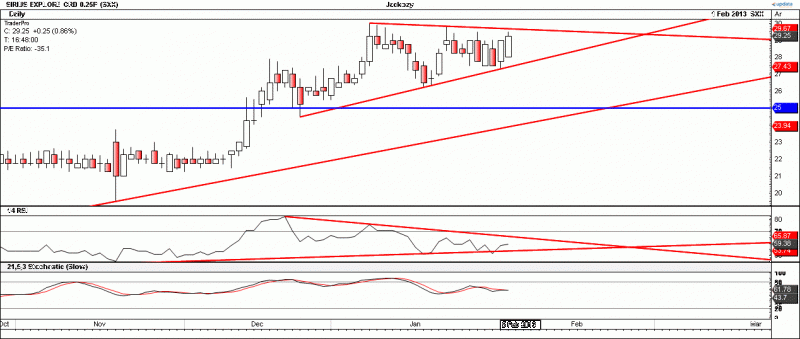 It currently looks like it's in a bullish pennant which formed at the resistance from previous price highs of 29p and 30p. A close above 30p ought to target 37-40p (there are targets for both of these levels). Here's the daily chart showing the possible pennant: