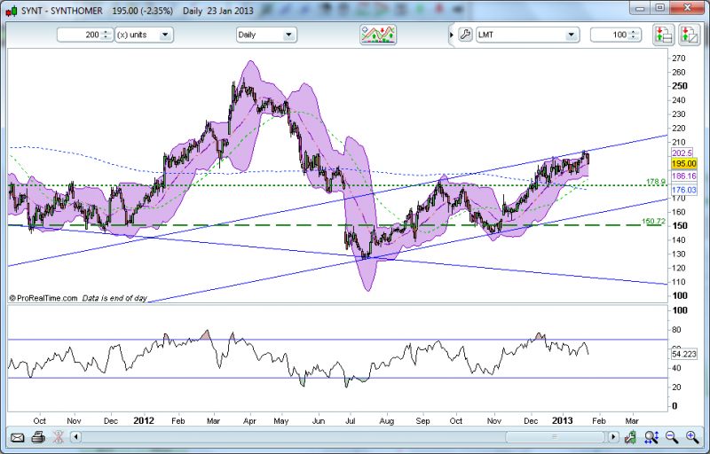 That's a very interesting take on Synt. I read this completely differently. On the daily chart I saw it clear the resistance at about 195/196 and it held as a support at the end of last week and bounced up to around 201 or so. So I bought in at that point and set stops just below what I thought was support. To my pained surprise the stop got hit and I promptly got in again a little lower having convinced myself that this would go back up again. Needless to say it has been hovering around that resistance level and it looks like it is sinking gradually lower int he water all the time.